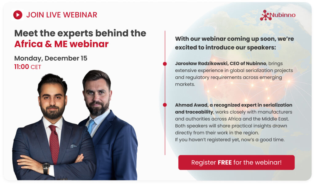 Webinary Pharma serialization audit – Nubinno Webinar Pharma serialization audit Download the E-book Pharma serialization in China – Nubinno Webinar Pharma serialization in China Download the E-book Pharma serialization in Italy – Nubinno Webinar Pharma serialization in Italy Download the E-book Transitional change management in pharma managing post M&A operations – Nubinno Webinar Transitional change management in pharma managing post M&A operations Download the E-book Kazakhstan market entry and serialization compliance – Nubinno Webinar Kazakhstan market entry and serialization compliance Download the E-book Vendor Selection for pharma serialization systems – Nubinno Webinar Vendor Selection for pharma serialization systems Download the E-book Key serialization updates Africa & ME – Nubinno Webinar Key serialization updates Africa & ME Download the E-book 1. Please add your name, and contact information where our colleague can easily contact you. 2. . Please enter your company name 3. Please describe your issues and how we can help you 4. Accept our Data Privacy and push the "Request consultation" button 5. Check your account, Vitold, the CEOO will contact you within 24 hours, on the given contact information We are ready to help your companyVitold CEO of Nubinno connect. Skontaktuj się z nami Imię i nazwisko: Nazwa spółki: Adres email: Prefiks: Telefon: Akceptuję politykę prywatności Polityka prywatności Poproś o rozmowę z konsultantem